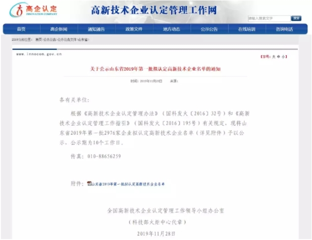 继11月齐鲁医学检验所通过中国合格评定国家认可委员会CNAS专家组ISO15189复评审现场评审喜讯之后,2019年11月28日,我所再传佳音,被全国高新技术企业认定管理工作领导小组拟认定为“高新技术企业”,依照规定经过公示,于近日确认正式通过2019年高新技术企业复审,再次荣膺”高新技术企业”称号。